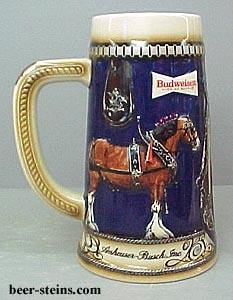 CS71 - 1987 Clipper Ship & Horse Drawn Wagon lidded stein. The 3rd of 5 in Budweiser's History of Brewing series of steins. This 9 1/2" lidded stein was made in Brazil by Ceramarte. This stein, antiqued and decorated with ornate trim, features an A&Eagle � trademark at the center. A decoratve ribbon with the words "Anheuser-Busch, Inc � " and "King of Beers" wraps around the body. Scenes of a clipper ship and a horse drawn wagon are illustrated and framed by oval relief designs on both sides of the stein. Individually numbered. Gift box.$35.00